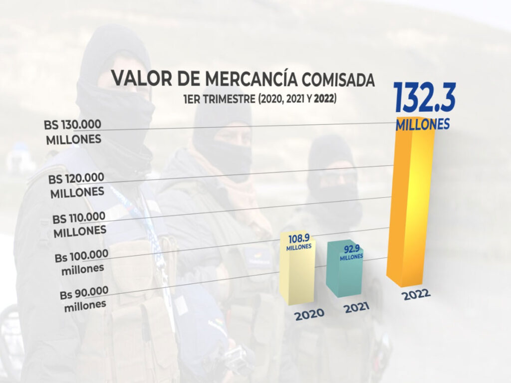 Según datos de la Aduana Nacional, de enero a marzo del año 2019, se incautó mercancía valuada en Bs 108,9 millones; en la gestión 2020, Bs 92,9 millones; situación que fue superada en 2021 obteniendo Bs 113,8 millones.