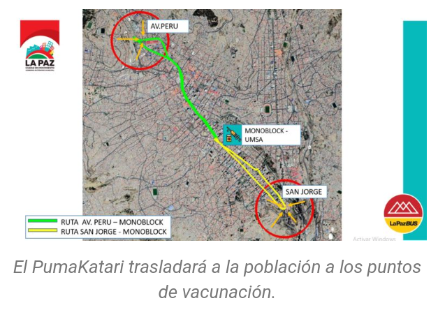 Fueron habilitadas paradas en el mercado km 7 de Pasankery, hospital municipal Cotahuma y en la Av. Buenos Aires, 3 de Mayo para llegar al punto de vacunación del Instituto Americano. Las paradas para trasladarse a la Facultad de Medicina de Miraflores estarán en el Cruce de Villas, inmediaciones de las oficinas de Samapa de Pampahasi, plaza del Minero y Kupini.
