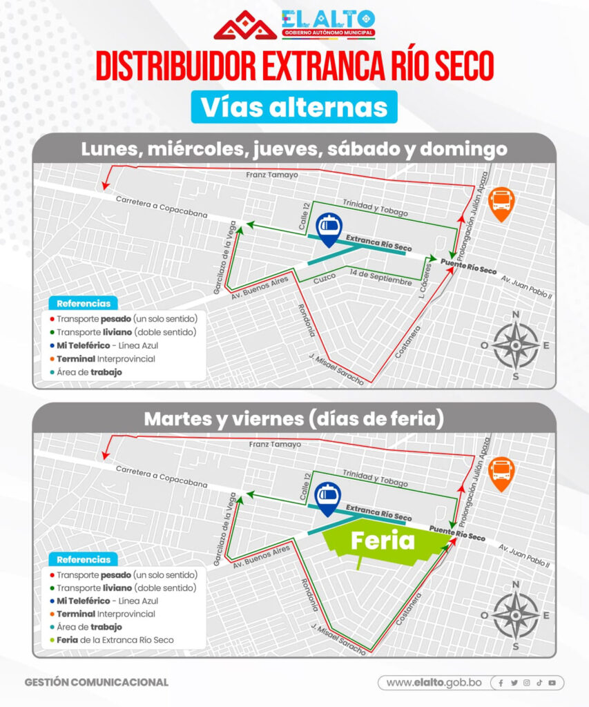 La Alcaldía de El Alto informó ayer lunes que por 450 días funcionará un nuevo circuito de vías alternas por la zona ‘Extranca Río Seco’, mientras duren las obras del distribuidor; los vehículos de carga pesada y liviana deberán ajustarse a estas modificaciones.