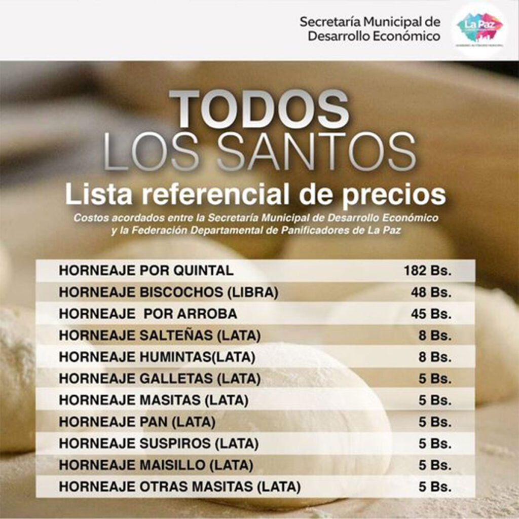 El secretario municipal de Desarrollo Económico del GAMLP, Marco Agramont, informó este jueves que la Alcaldía de La Paz y la dirigencia de panificadores acordaron el precio del horneado por lata de masitas a Bs. 5 y el quintal de harina a Bs. 182, ante la proximidad de la festividad de Todos Santos.