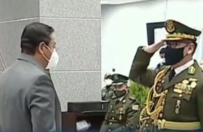 El presidente Luis Arce ratificó al comandante general de la Policía, Jhonny Aguilera, quien junto a otros dos jefes policiales ascendieron al grado de general primero de la institución del orden ayer por la noche en ‘Casa Grande del Pueblo’.
