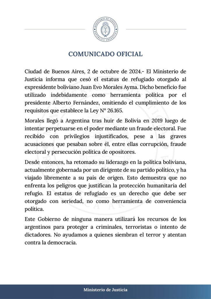 “Dicho beneficio fue utilizado indebidamente como herramienta política por el presidente Alberto Fernández. (…) Morales llegó a Argentina tras huir de Bolivia en 2019. (…) Fue recibido con privilegios injustificados pese a las graves acusaciones que pesaban sobre él, entre ellas corrupción, fraude y persecución política de opositores”, indica el comunicado.