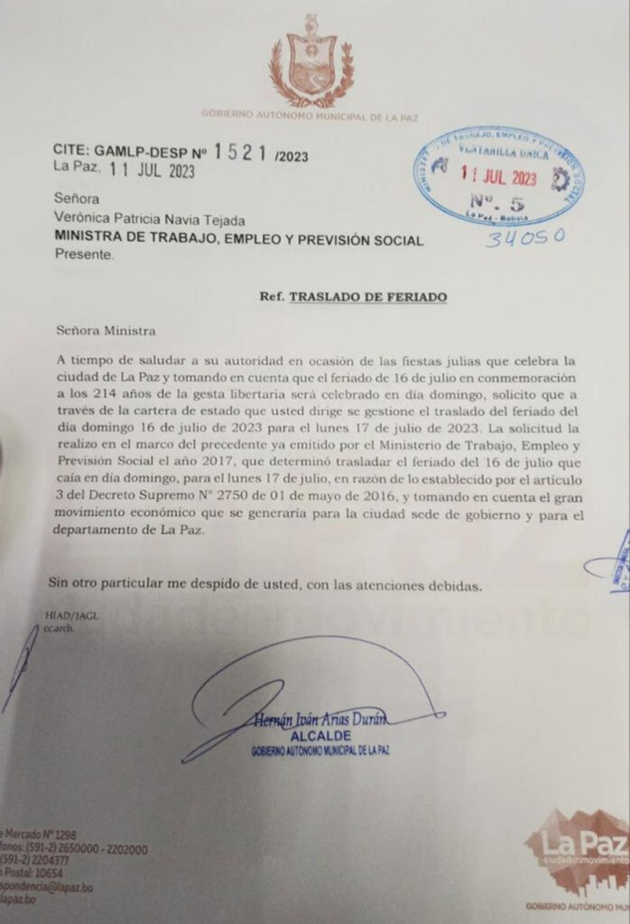 “La solicitud la realizó en el marco del precedente ya emitido por el Ministerio de Trabajo, Empleo y Previsión Social en el año 2017, que determinó trasladar el feriado del 16 de julio, que caía en domingo, para el lunes 17 de julio, en razón de lo establecido en el artículo 3 del Decreto Supremo No 2750 del 1 de mayo de 2016, y tomando en cuenta el gran movimiento económico que se generaría para la ciudad sede de gobierno y para el departamento de La Paz”, agrega la misiva.