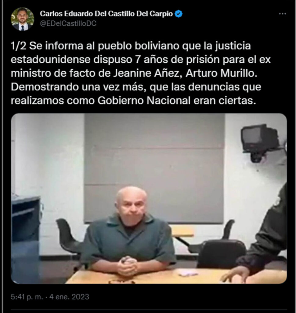 “Se informa al pueblo boliviano que la justicia estadounidense dispuso 7 años de prisión para el exministro de facto de Jeanine Añez, Arturo Murillo. Demostrando una vez más, que las denuncias que realizamos como Gobierno Nacional eran ciertas”, indicó Del Castillo a través de su cuenta de Twitter.