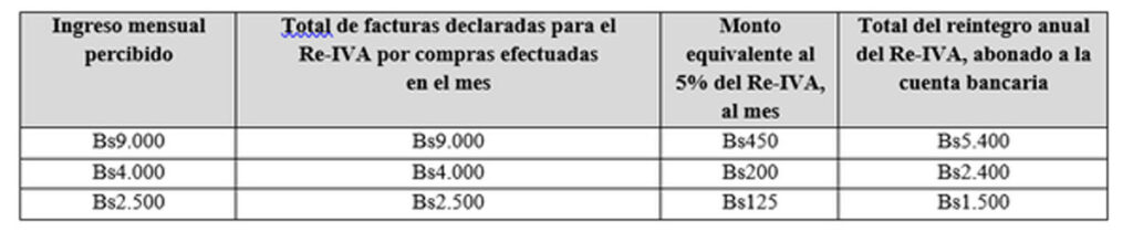 Los asalariados del sector público y privado con un ingreso mensual igual o menor a Bs 9.000 tienen derecho a registrarse en el Régimen de Reintegro del Impuesto al Valor Agregado (Re-IVA) para recibir cada mes la devolución en efectivo del 5% del IVA.