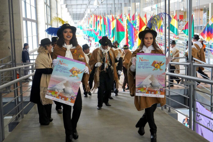 La Terminal Metropolitana El Alto, que en el lado sur acoge los stands de 58 expositores (entre librerías, editoriales e instituciones), fueron el escenario donde la reconocida fraternidad orureña hizo su paso antes de presentar un fotolibro.