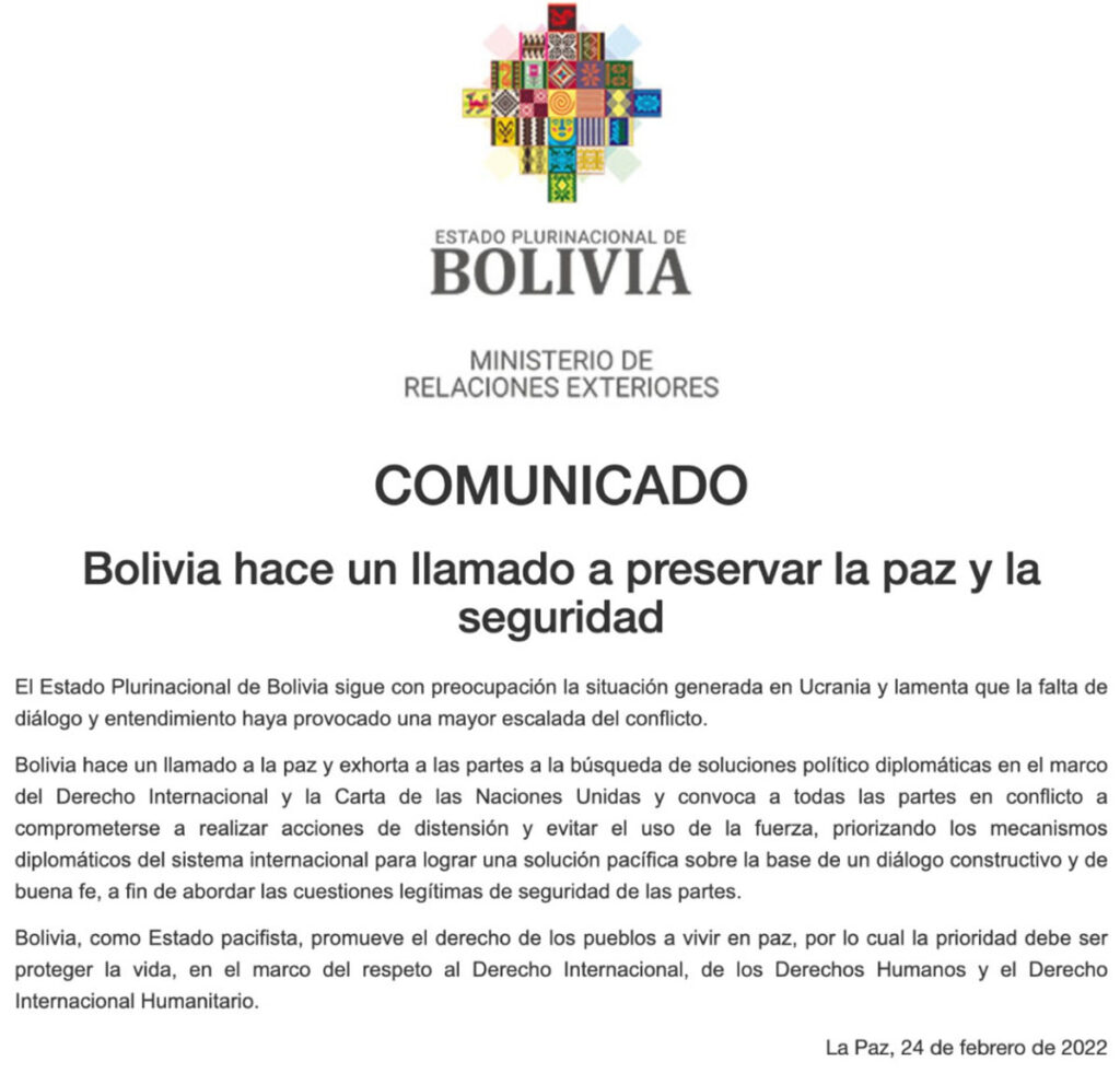 “Bolivia hace un llamado a la paz y exhorta a las partes a la búsqueda de soluciones político diplomáticas en el marco del Derecho Internacional y la Carta de las Naciones Unidas y convoca a todas las partes en conflicto a comprometerse a realizar acciones de distensión y evitar el uso de la fuerza, priorizando los mecanismos diplomáticos del sistema internacional para lograr una solución pacífica sobre la base de un diálogo constructivo y de buena fe, a fin de abordar las cuestiones legítimas de seguridad de las partes”, añade el documento.