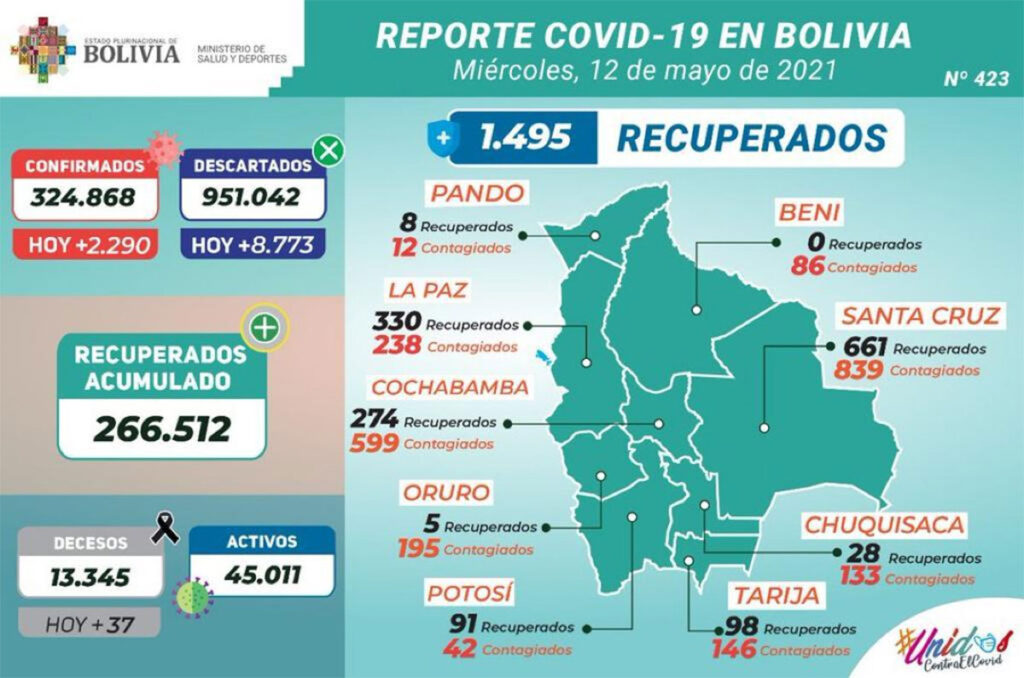 De acuerdo al Reporte N° 423 del Ministerio de Salud y Deportes, la cifra de contagios de COVID-19 en el país llegó a 2.290 nuevos casos este miércoles, mientras que los pacientes recuperados de la enfermedad fueron 1.495.