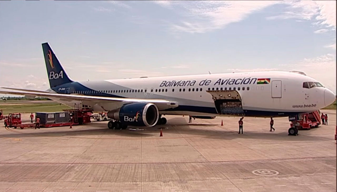 El lote de cinco fármacos para el tratamiento ambulatorio y de terapia intensiva fue transportado en un avión Boeing 767 de la aerolínea estatal Boliviana de Aviación (BoA) que llegó al aeropuerto internacional de Viru Viru, Santa Cruz, aproximadamente a las 10.30.