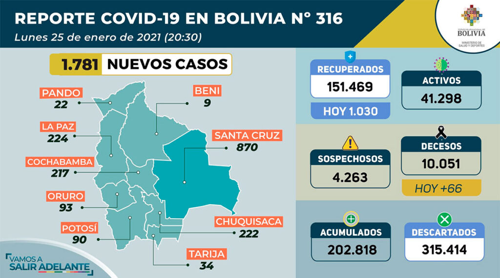 Los departamentos que registraron la mayor cantidad este lunes son Santa Cruz con 870 positivos, La Paz con 224, Chuquisaca 222 y Cochabamba 217.