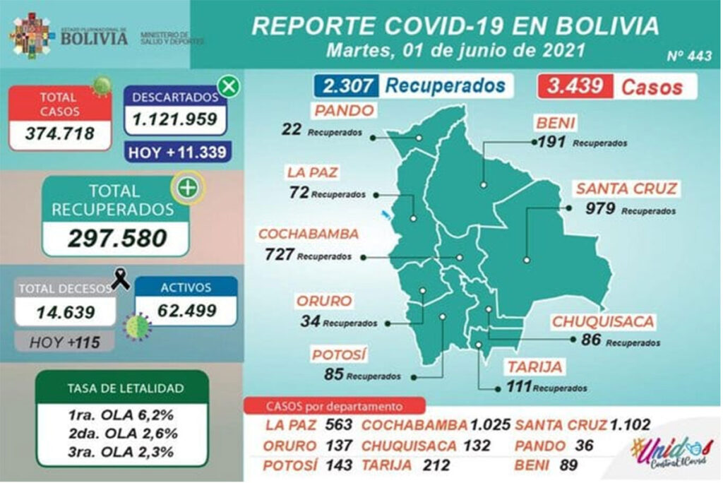 Bolivia reportó este martes 3.439 casos de COVID-19 y 115 decesos de la jornada, un nuevo record de lo que va la pandemia en nuestro país.