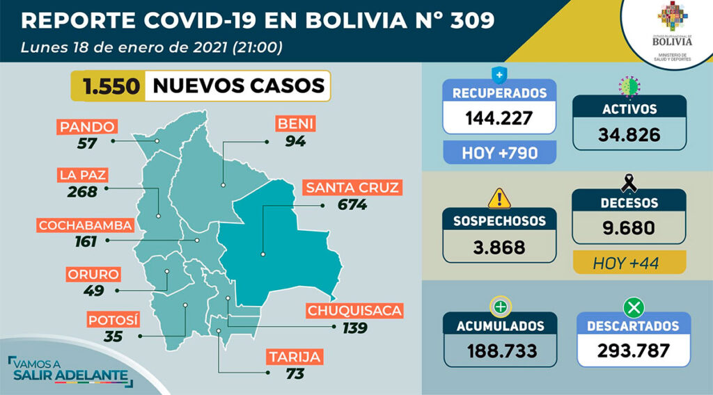 Con los nuevos casos reportados, Bolivia sube a 188.733 pacientes con coronavirus, 3.868 casos sospechosos, 293.787 descartados y 144.227 recuperados.