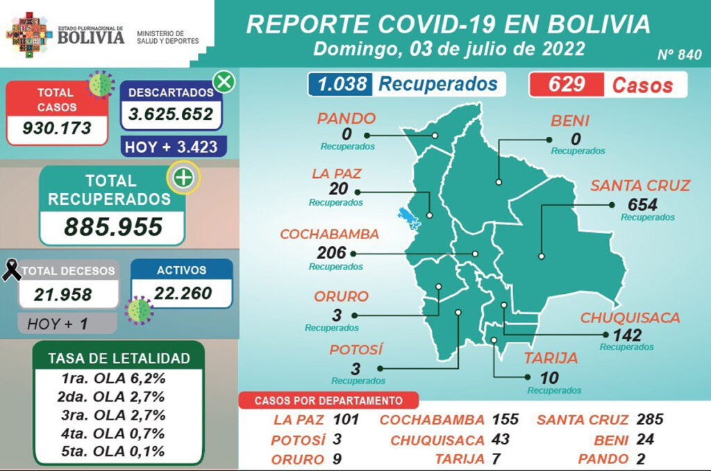 Bolivia reportó este domingo 629 nuevos casos de Covid-19 y 1.038 pacientes se recuperaron de este mal; de acuerdo al diagnóstico masivo se realizaron 4.052 pruebas y 3.423 fueron descartadas.