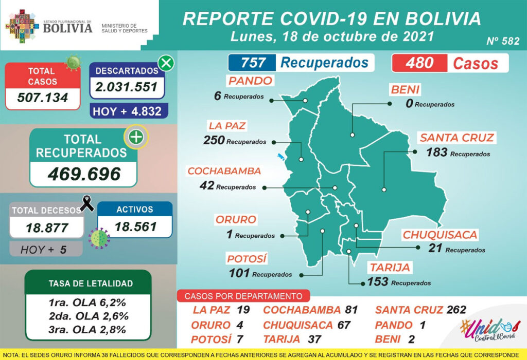 El Reporte N° 582 del Ministerio de Salud y Deportes informó que la cifra de contagios de COVID-19 en el país fue de 480 casos este lunes; mientras que los pacientes recuperados de la enfermedad fueron 757. Los decesos llegaron a 5 y los casos descartados a 4.832 durante esta jornada.