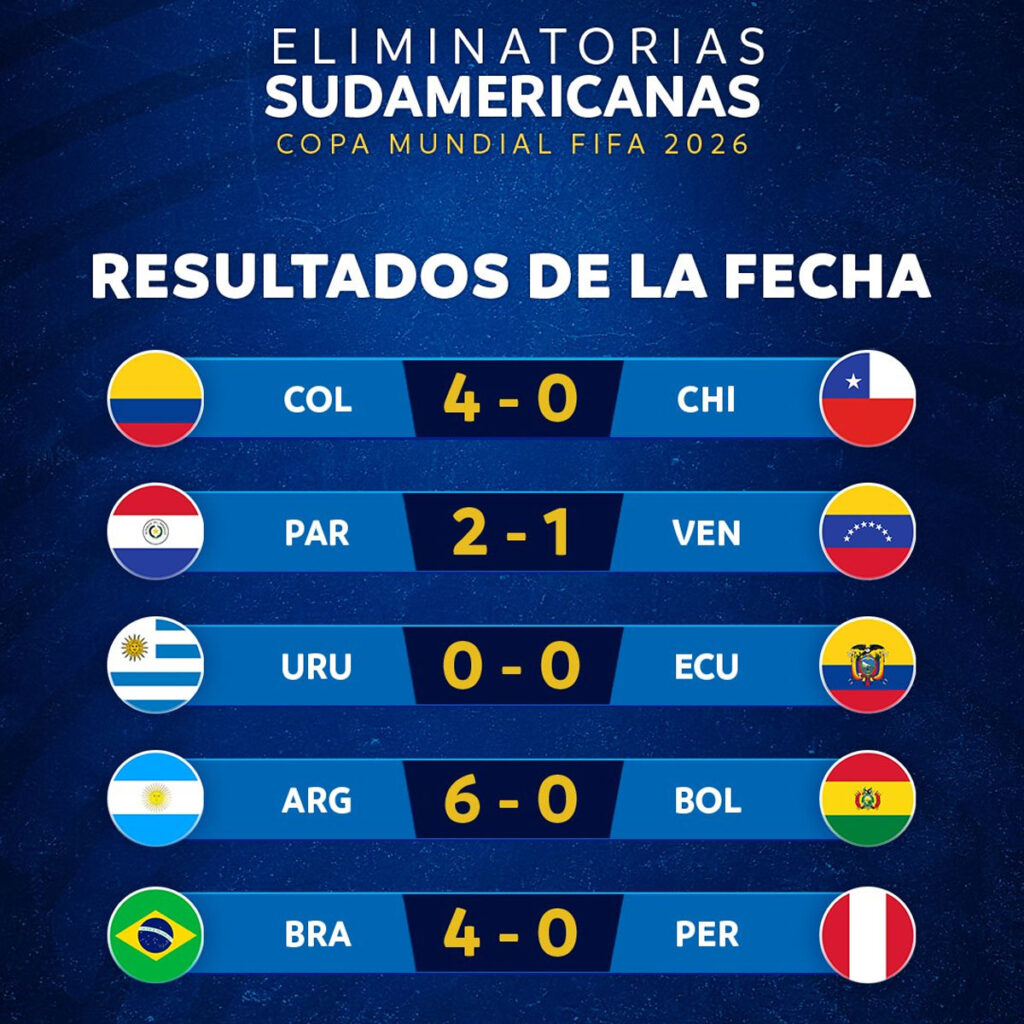 Con este resultado, Argentina llegó a 22 puntos como indiscutible líder de las eliminatorias, mientras que Bolivia se quedó con 12 y bajó al séptimo puesto (zona de repechaje); además, con el peor gol diferencia entre todos los equipos.