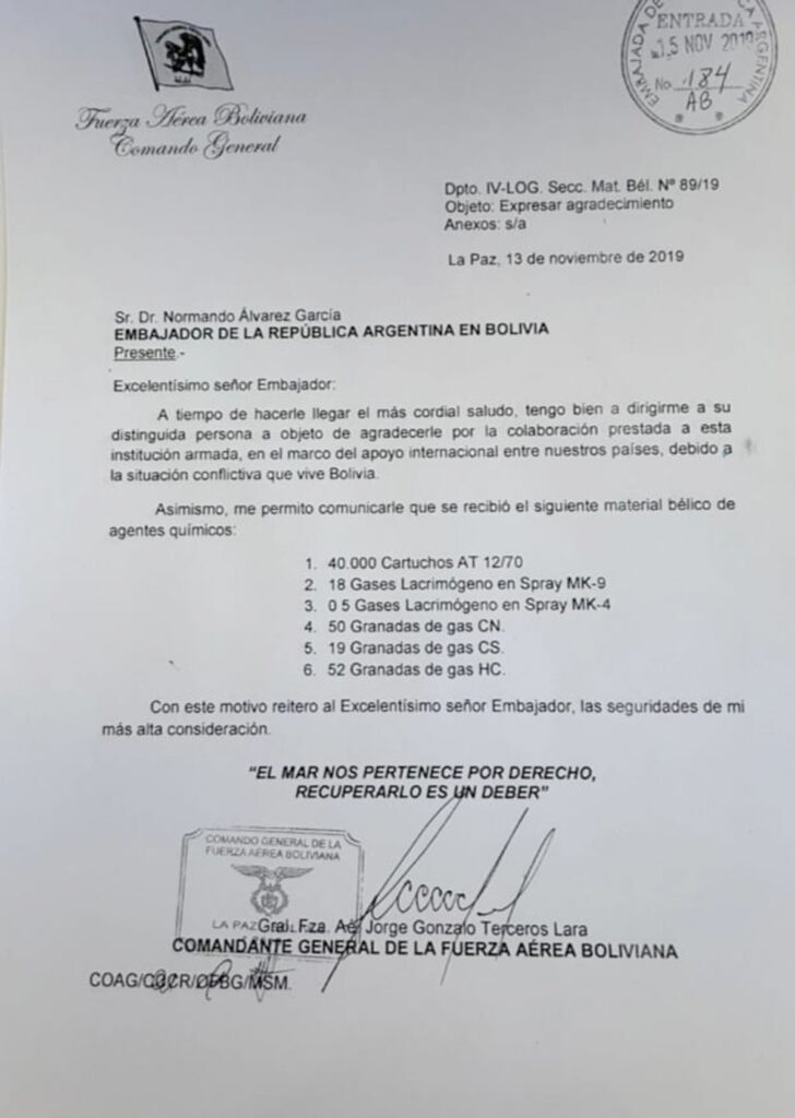 Detalló que la nota agradece al diplomático del vecino país “por la colaboración prestada a esta institución armada (la FAB) en el marco del apoyo internacional entre nuestros países”.