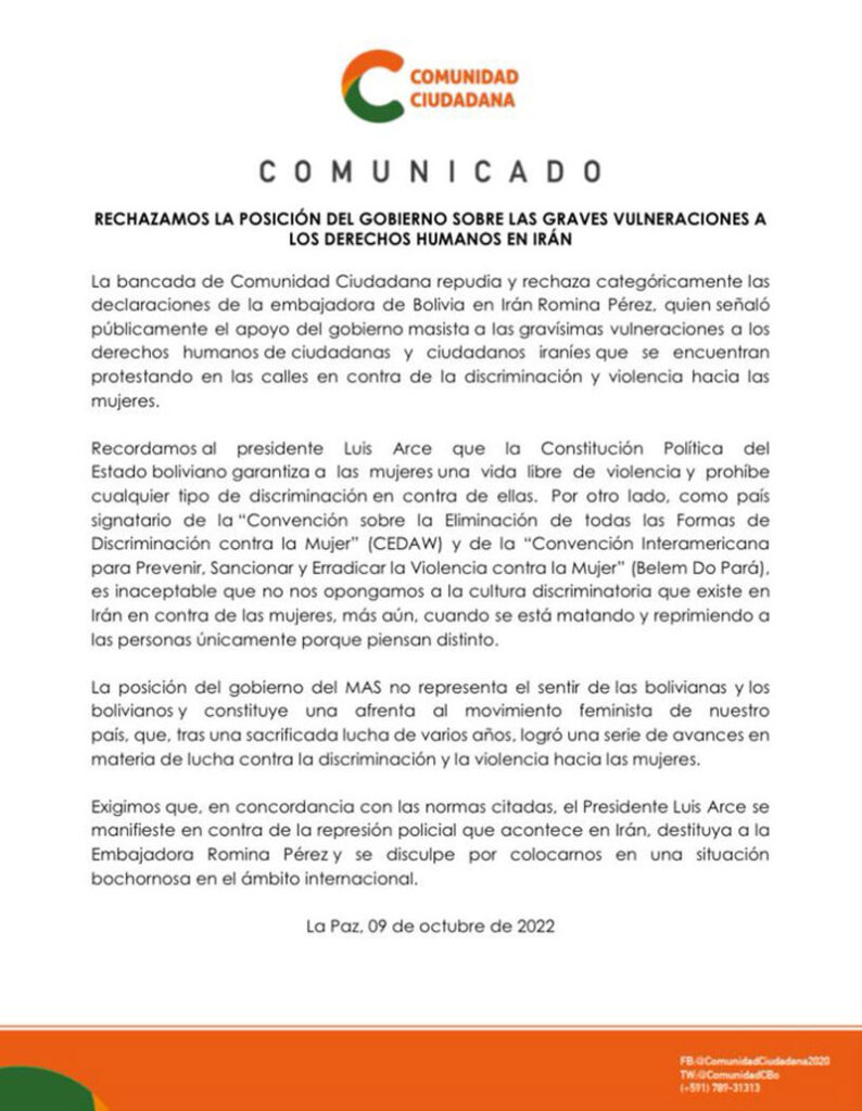 “Exigimos que (…) el presidente Arce se manifieste en contra de la represión policial que acontece en Irán, destituya a la embajadora Romina Pérez y se disculpe por colocarnos en un situación bochornosa en el ámbito interncional”, dice la notificación.