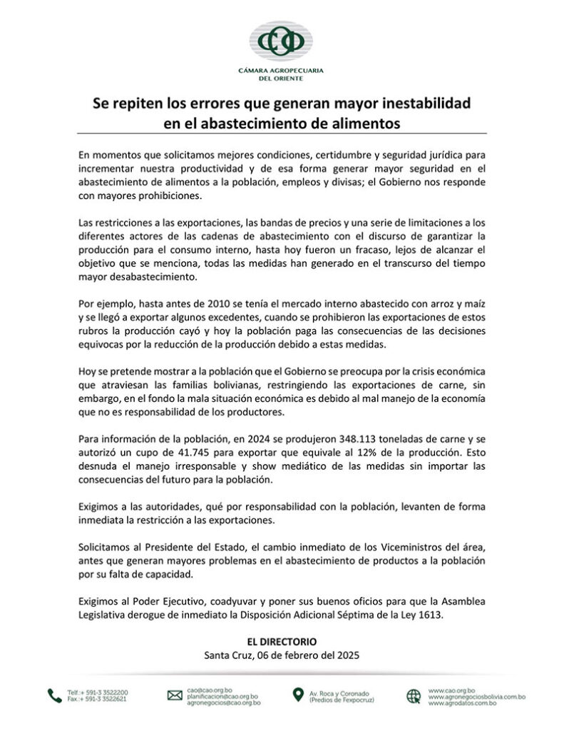 “Hoy se pretende mostrar a la población que el Gobierno se preocupa por la crisis económica que atraviesan las familias bolivianas, restringiendo las exportaciones de carne, sin embargo, en el fondo, la mala situación económica se debe al mal manejo de la economía, que no es responsabilidad de los productores”, agregan los empresarios.