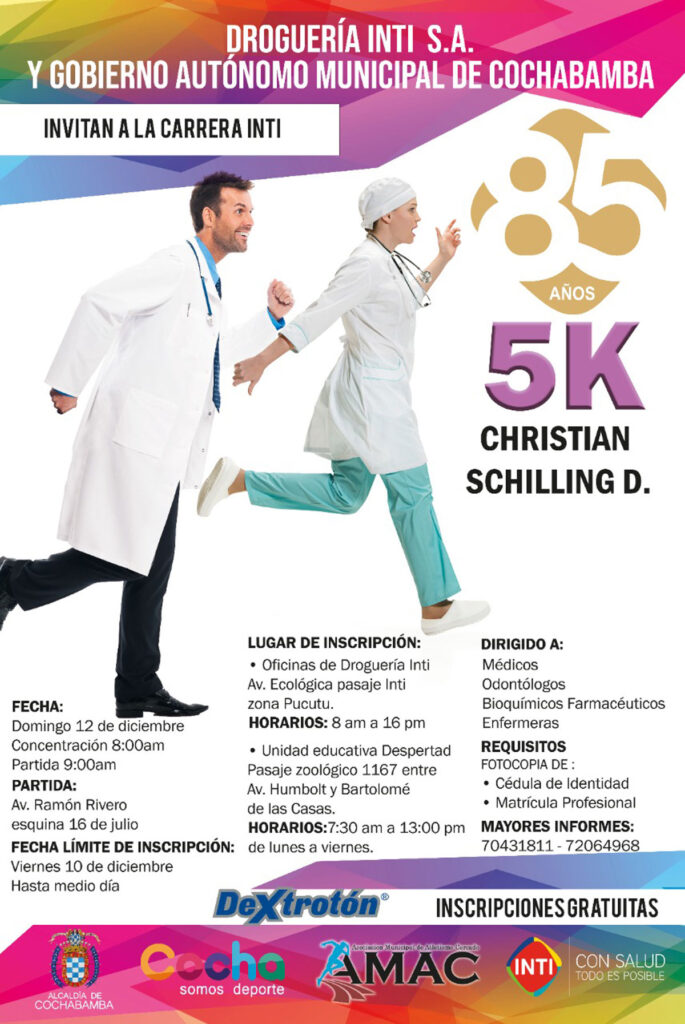 La meta está definida. Este 12 de diciembre, hay un gran reto por cumplir: cinco kilómetros al trote. Médicos, enfermeras, odontólogos, farmacéuticas y todos los ciudadanos que apuestan por la salud están invitados a participar de la 1ra carrera pedestre “85 años Christian Schilling Dalgas” organizado por Droguería INTI y el Gobierno Autónomo Municipal de Cochabamba.