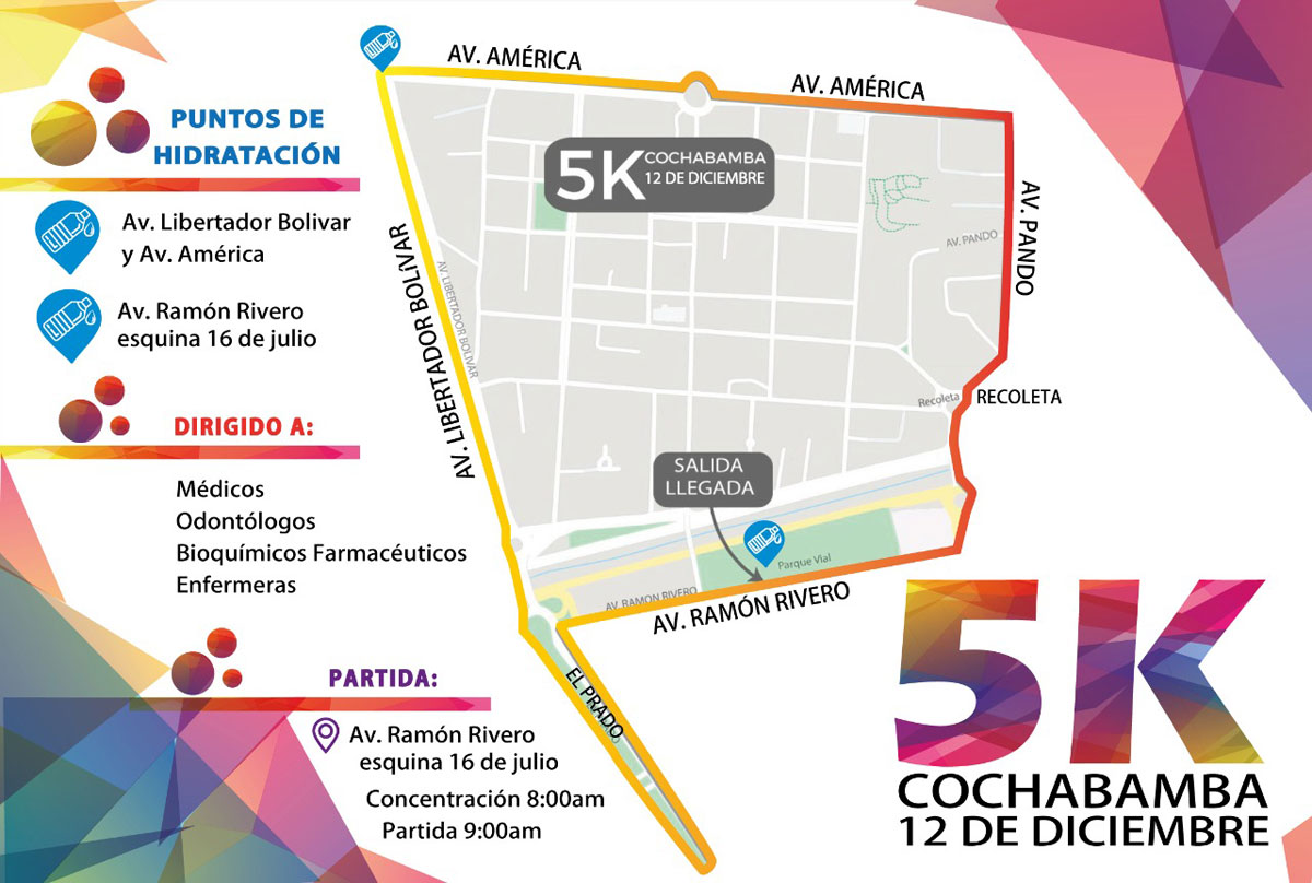 “La salida será el día domingo 12 a partir de las 9:00 desde el Parque Vial ubicado en la Avenida Ramón Rivero y, durante la ruta, contaremos con dos puntos de hidratación y el apoyo de Droguería INTI. Queremos animar a nuestros ángeles de blanco y a todos los profesionales de la salud d Cochabamba a que se preparen y sean parte de esta iniciativa que, sin duda, permitirá un grato tiempo de confraternización, por supuesto sin descuidar las medidas de bioseguridad”, comentó.