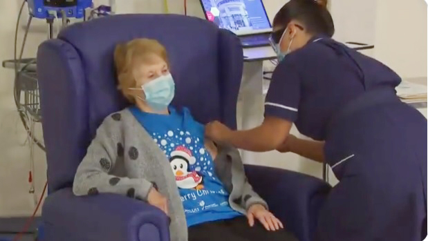 Margaret Keenan se llama la primera mujer que recibió la dosis en esta etapa de inicio de la vacunación masiva. Lo hizo en hospital de Coventry, en el centro de Inglaterra, y las imágenes del momento, donde se la ve con una polera navideña de color azul, circularon de inmediato en todo el planeta.