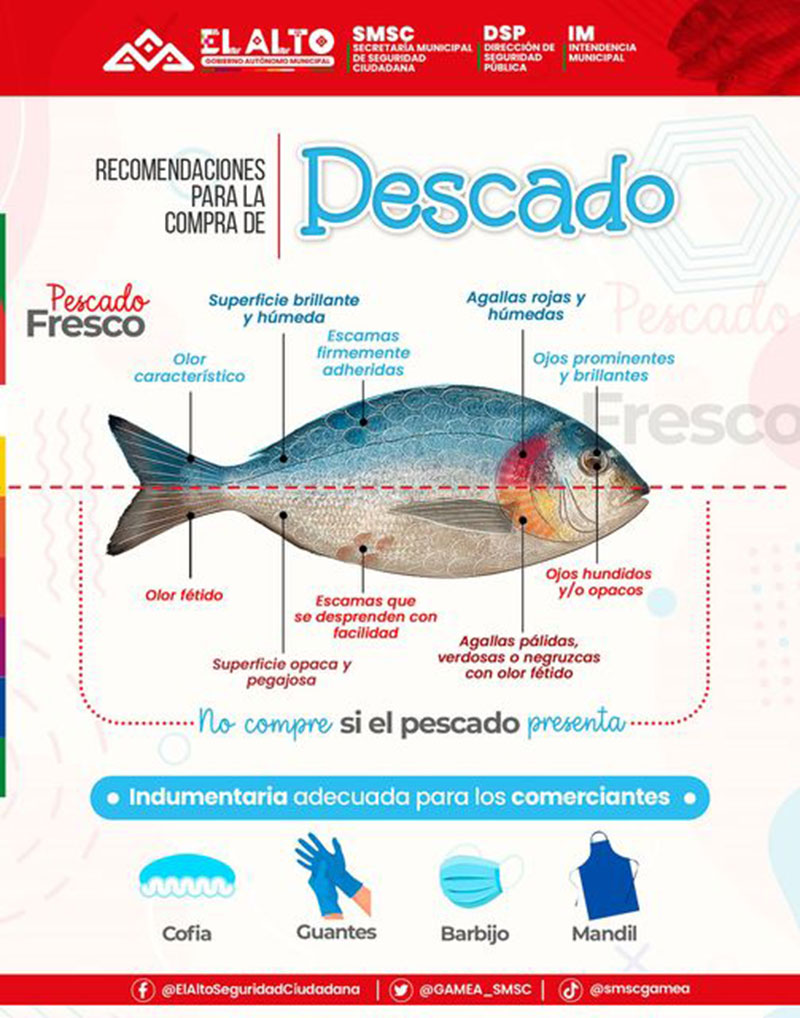 Durante Semana Santa, el comercio de pescados prolifera en la ciudad de El Alto por lo que algunas comerciantes del mercado Los Andes recomiendan a sus clientes identificar el buen estado de la carne con algunas señales, como: agallas rojas, escamas firmes y adheridas, ojos ‘saltones’ y buena consistencia del producto.