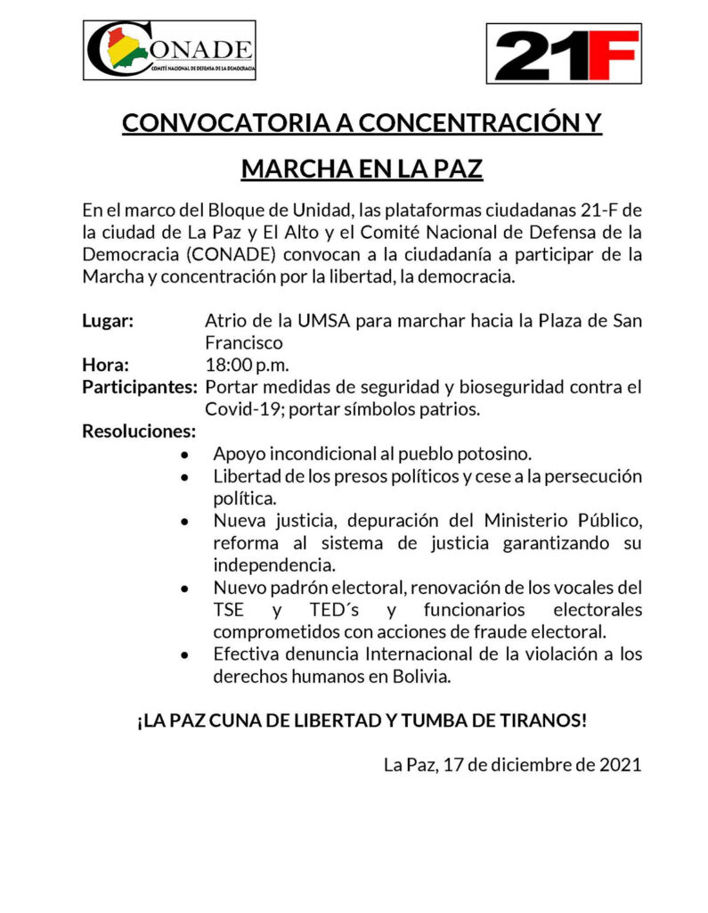 El Comité Nacional de Defensa de la Democracia (Conade), Comité Cívico Potosinista (Comcipo), plataformas 21F y “bloques de unidad” anuncian movilizaciones este viernes en La Paz, Oruro, Potosí y Sucre (Chuquisaca); por la liberación de los “presos políticos”, la construcción de un nuevo padrón, la renovación del Tribunal Supremo Electoral (TSE) y por una reforma judicial.