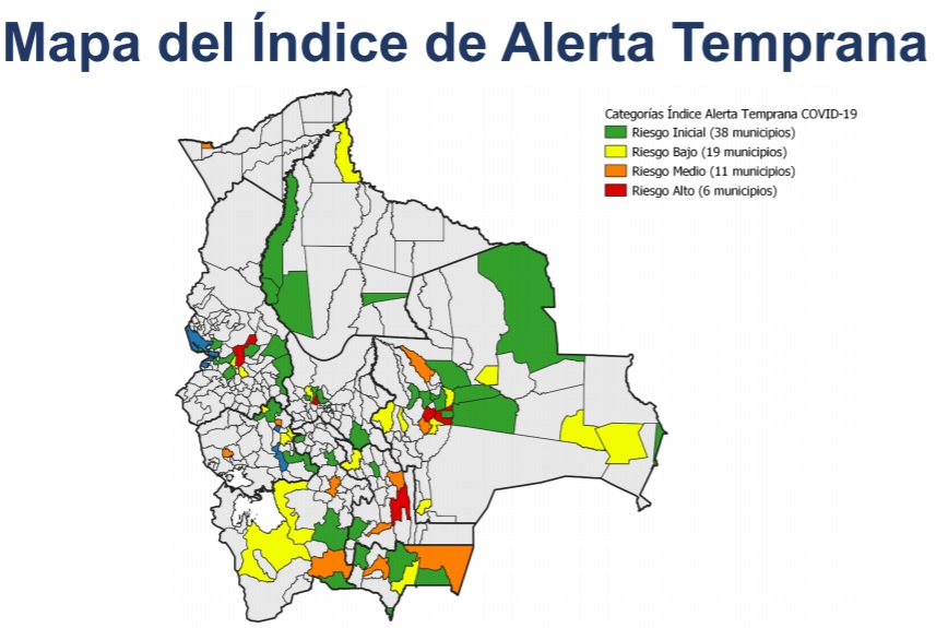 El último reporte del Ministerio de Salud da cuenta que “los municipios en riesgo alto (de contagio) son: Monteagudo (Chuquisaca), La Paz (La Paz), Cochabamba (Cochabamba), Huachacalla (Oruro), Porongo (Santa Cruz) y Santa Cruz de la Sierra (Santa Cruz)”.
