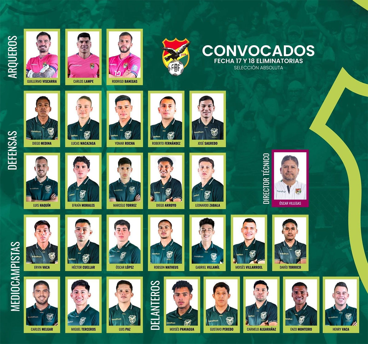 Melgar, clave en la campaña de Bolívar en la Copa Sudamericana, suma su primera convocatoria oficial en eliminatorias tras haber disputado solo tres amistosos con la Verde. Mientras que Vaca, hoy en Oriente Petrolero, regresa después de un año: su último partido fue justamente en el debut de Villegas, en septiembre de 2024 ante Venezuela.
