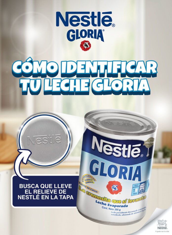 En un esfuerzo por aportar a la seguridad alimentaria y proteger la salud de los consumidores, Gloria, marca de lácteos de Nestlé, recomienda adquirir la leche evaporada Gloria, que cuente con el sello distintivo de calidad y autenticidad de la marca, por lo tanto, se debe revisar que la tapa del producto lleve “Nestlé” en alto relieve (litografiada) además de un sello de seguridad visible en la etiqueta.