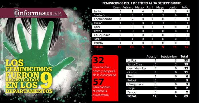 En enero, febrero y septiembre, antes y después de la cuarentena, se suscitaron 32 feminicidios. De los 89 casos en los primeros nueve meses del año, la mayoría se reportó en el departamento de La Paz, con 33; seguido por Santa Cruz, con 15; Cochabamba, con 12; y Oruro, con 11. En Beni hubo seis casos; en Potosí, cinco; en Chuquisaca, tres; en Tarija, dos; y en Pando, dos.