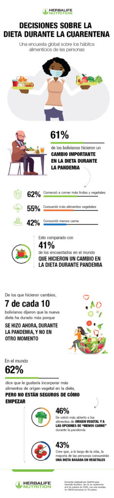 La encuesta a 1.000 bolivianos reveló que 61% de ellos modificó la dieta en los últimos siete meses y que la pandemia ayudó a muchos a cumplir con el cambio. 7 de cada 10 encuestados manifestó que su nueva dieta dura más porque la hicieron durante la pandemia actual, a diferencia de si lo hubieran hecho en otro momento.