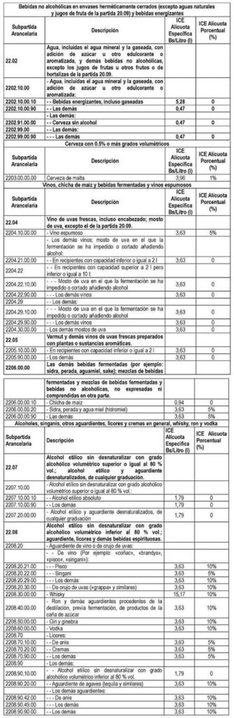 La partida de bebidas energizantes, incluso gaseadas, establece una alícuota específica de Bs/Litro de 5,28; para la cerveza de malta de 3,96; para pisco de 3,63; para singani de 3,63; para whisky de 15,17; para el ron de 3,63; y para el vodka de 3,63, entre otras identificadas en la nueva tabla.