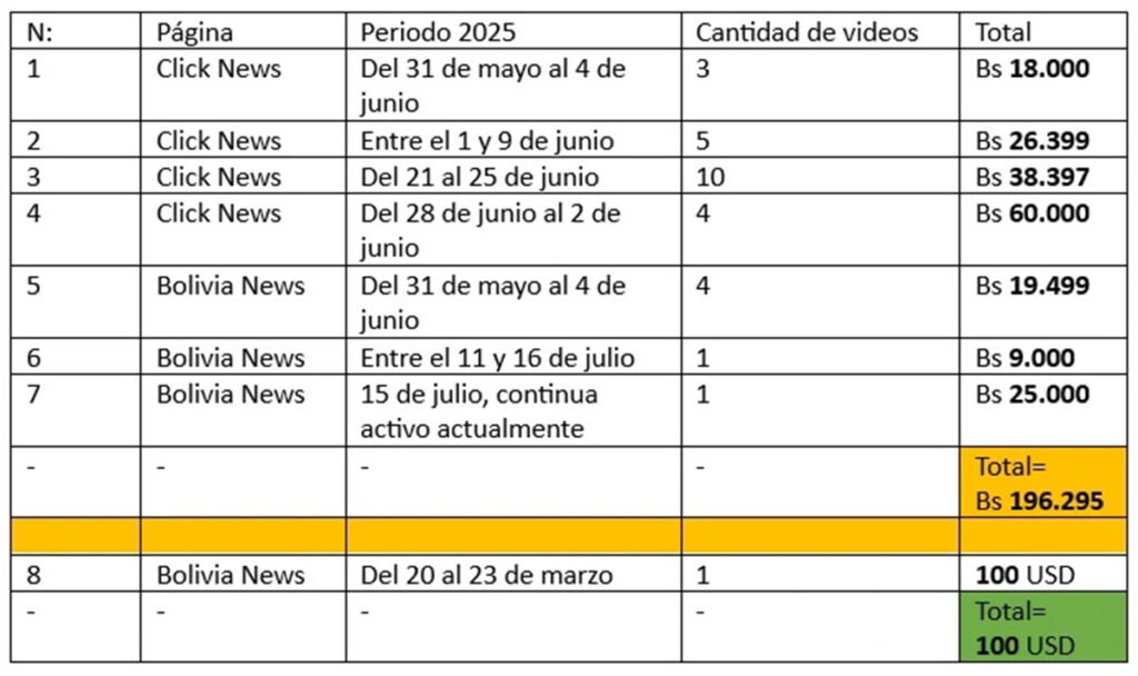 Bolivia News, por su parte, fue creada en noviembre de 2022 bajo el nombre “Amigos de la Llajta”, y pasó a su denominación actual en febrero de 2025. La cuenta se presenta como una organización sin fines de lucro, con 12 operadores: 10 en Bolivia y 2 en México. Aunque figura como domiciliada en Santa Cruz de la Sierra, la inversión publicitaria fue realizada desde Cochabamba.