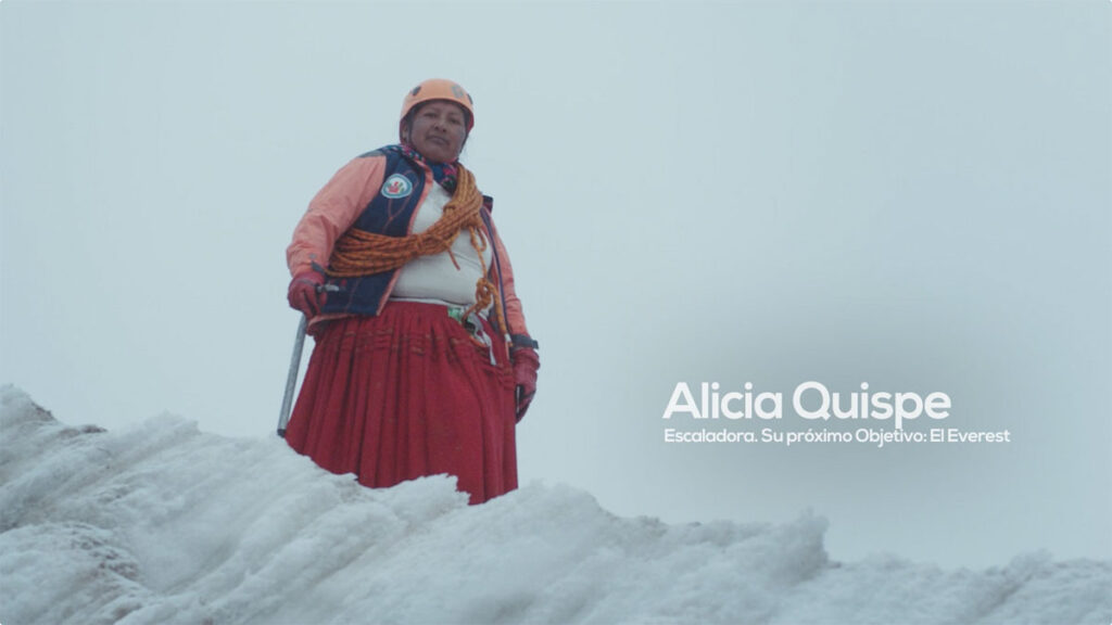 Y a más de 5.000 metros sobre el nivel del mar, Alicia Quispe rompe el hielo en las alturas del Huayna Potosí, el nevado que custodia las ciudades de La Paz y El Alto. La pieza audiovisual cierra con la sonrisa de esta valerosa mujer, quien ha vencido muchos obstáculos para llegar a la cima. Además, ella tiene en la mira la cumbre más alta del planeta, el Everest.