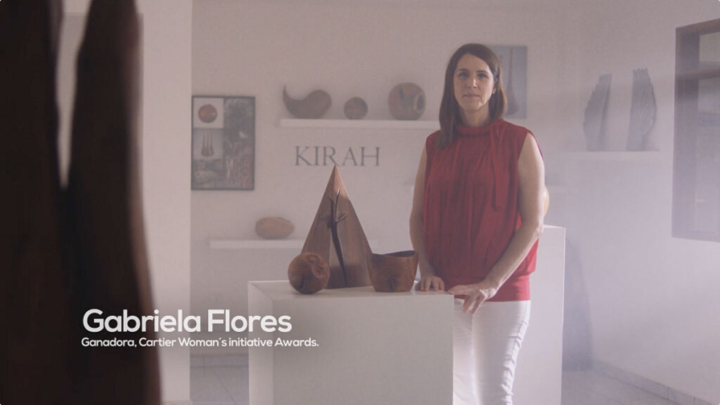 En el plano artístico, la pieza muestra a Gabriela Flores, ganadora Cartier Women’s iniciative Awards, donde mostró su capacidad transformadora de la naturaleza. Una emprendedora creativa, amante de la madera.