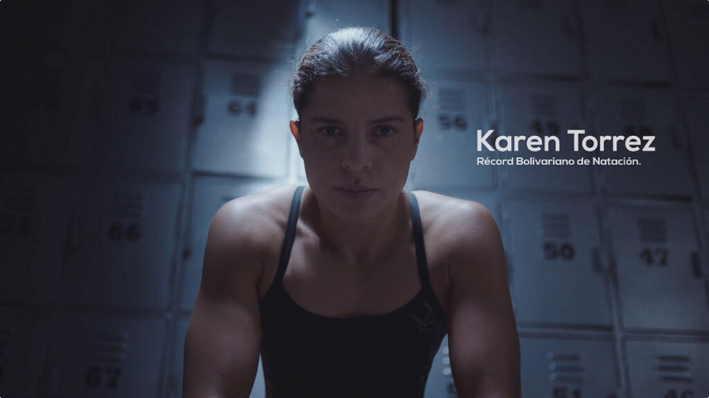 Karen Torrez, la campeona bolivariana de natación (2017), sale de los vestidores y se sumerge en la piscina donde batió el récord que le dio varias alegrías al país. La imagen destaca la fuerza de la atleta y sus logros.