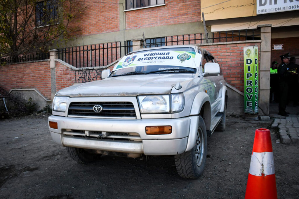 La Dirección Nacional de Prevención e Investigación de Robo de Vehículos (Diprove) recuperó el vehículo que fue robado el pasado fin de semana a una pareja de adultos mayores en la ciudad de El Alto, confirmó el director nacional de Diprove, Ricardo Berdeja.