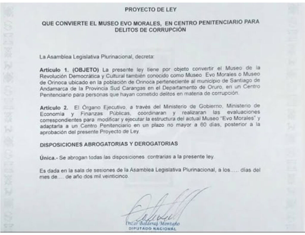El diputado de Comunidad Ciudadana (CC), Óscar Balderas, ha presentado un proyecto de ley que busca transformar el Museo de la Revolución Democrática y Cultural, conocido también como «Museo Evo Morales», en Orinoca, en un centro penitenciario para personas condenadas por delitos de corrupción.