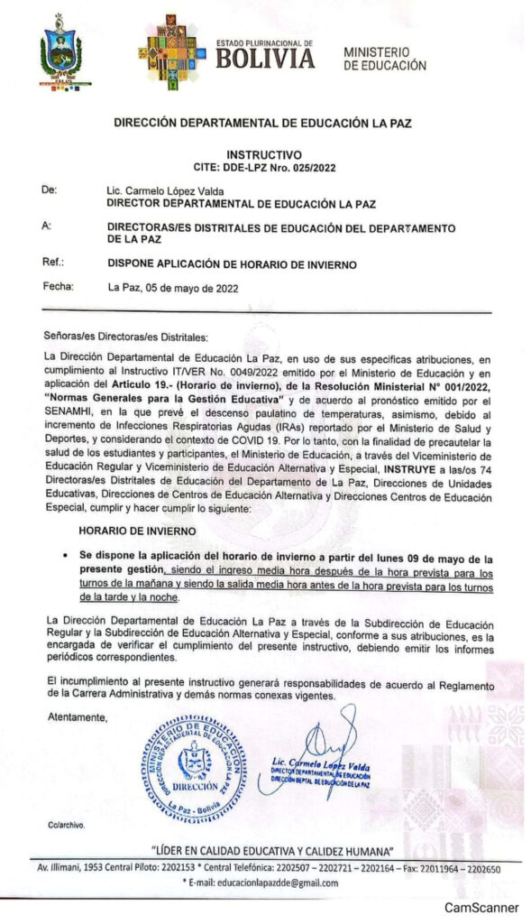 “Después de analizar los reportes de descensos de temperatura y las recomendaciones del Ministerio de Salud y del Senamhi (Servicio Nacional de Meteorología e Hidrología). Hemos decidido emitir el instructivo que determina el horario de invierno en los departamentos de La Paz, Oruro y Potosí, desde el lunes 9 de mayo”, informó el ministro de Educación, Edgar Pary Chambi, en conferencia de prensa brindada en la ciudad de La Paz.