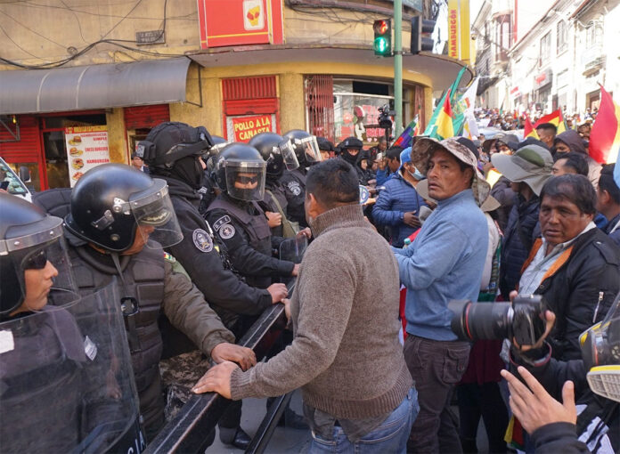 Este miércoles, el comandante departamental de la Policía en La Paz, Gunther Agudo, informó que dos policías resultaron heridos en los hechos de violencia protagonizados por seguidores de Evo Morales en su intento por ingresar a plaza Murillo.