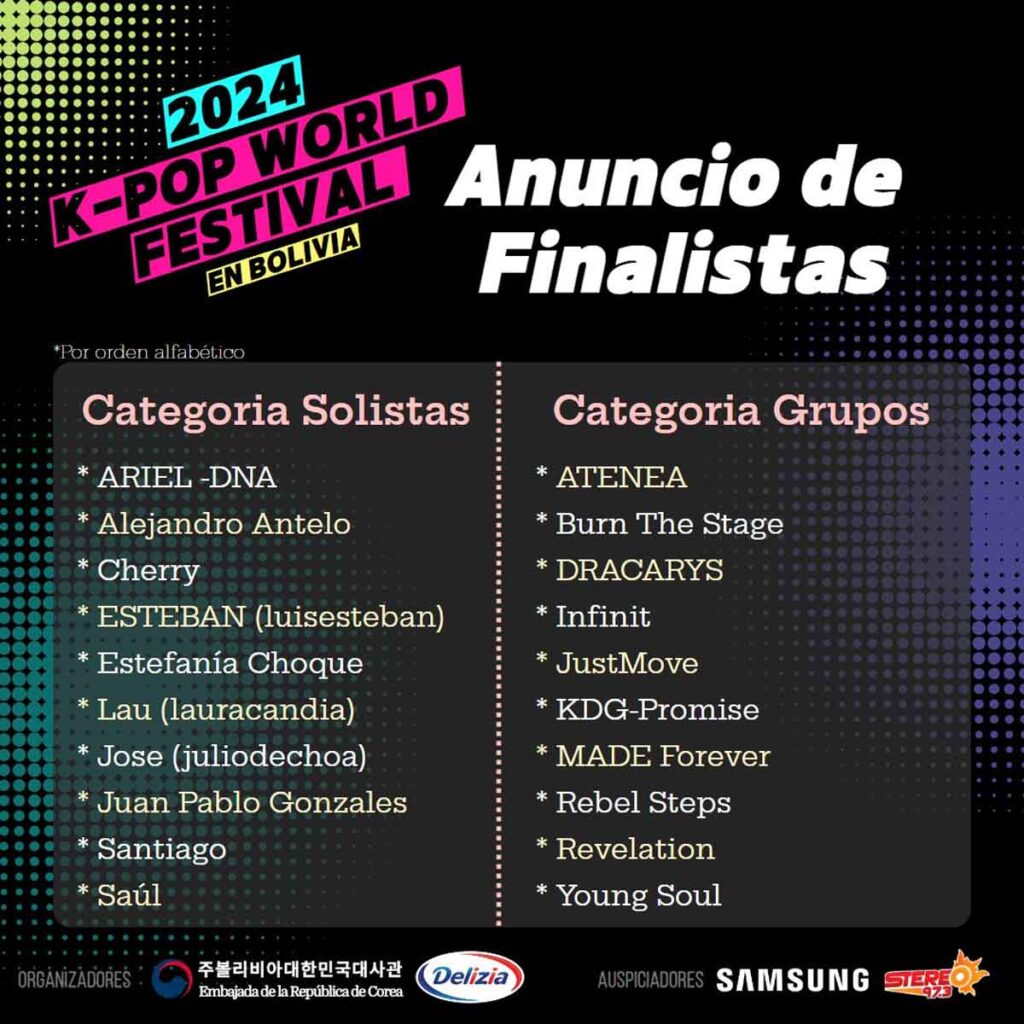 Además, este año, el K-Pop World Festival en Bolivia llega con altas expectativas pues la empresa Delizia participa como co-organizador oficial del evento, también contará con el apoyo de auspiciadores como Samsung Bolivia y la Radio Stereo 97.3, mientras que el reconocido tiktoker Mattias Mirk será el maestro de ceremonias.