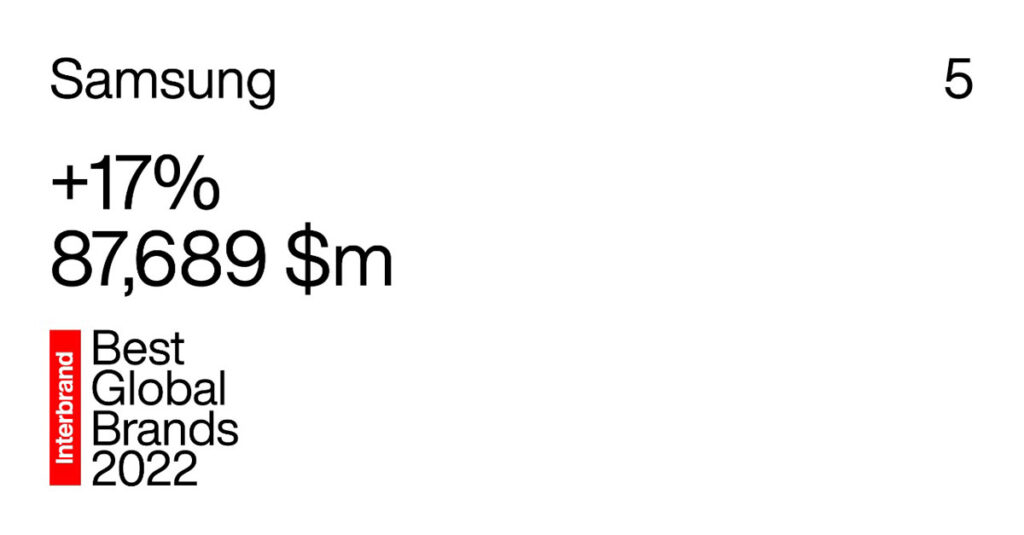 La consultora de marca global, Interbrand, reconoce a Samsung como una de las cinco “Mejores Marcas Globales” 2022. El valor de la marca de tecnología se evalúa en US$ 87.7 mil millones, lo que representa un crecimiento del 17%, en comparación con los US$ 74.6 mil millones en 2021, ubicando a la empresa en el quinto lugar por tres años consecutivos.