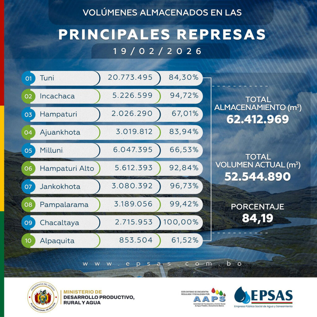 La Empresa Pública Social de Agua y Saneamiento (EPSAS S.A.) informó que el sistema de las diez principales represas que abastecen a las ciudades de La Paz y El Alto alcanza actualmente el 84% de su capacidad total de almacenamiento, con tres embalses en situación de rebalse, un comportamiento considerado normal durante la temporada de lluvias.