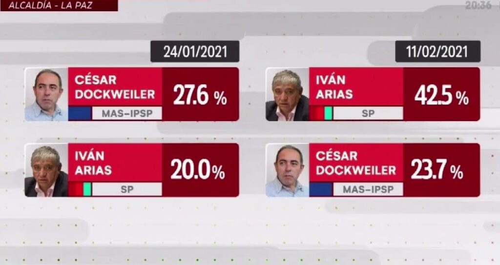 El exministro y municipalista Iván Arias, del frente Somos Pueblo, supera con más de 18 puntos al exgerente de Mi Teleférico y candidato del Movimiento Al Socialismo (MAS) a la Alcaldía de La Paz, César Dockweiler, según la encuesta de intención de voto realizada por la empresa Ciesmori y difundida este jueves por la red Unitel.