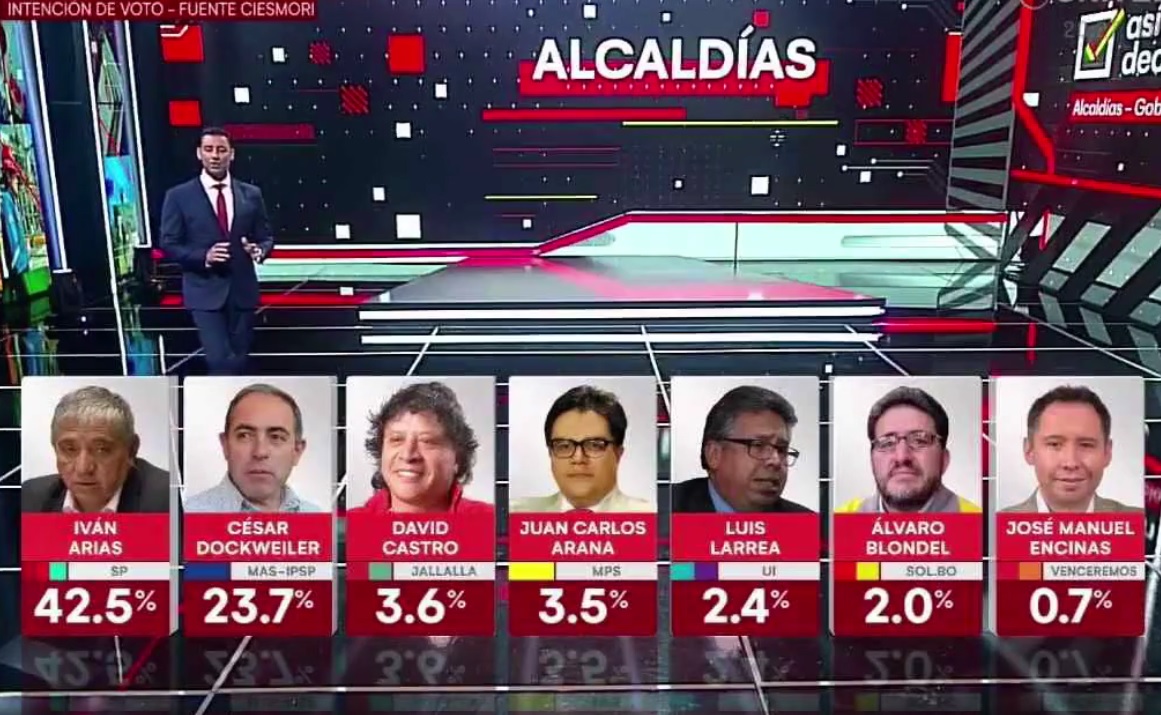 El exministro y municipalista Iván Arias, del frente Somos Pueblo, supera con más de 18 puntos al exgerente de Mi Teleférico y candidato del Movimiento Al Socialismo (MAS) a la Alcaldía de La Paz, César Dockweiler, según la encuesta de intención de voto realizada por la empresa Ciesmori y difundida este jueves por la red Unitel.