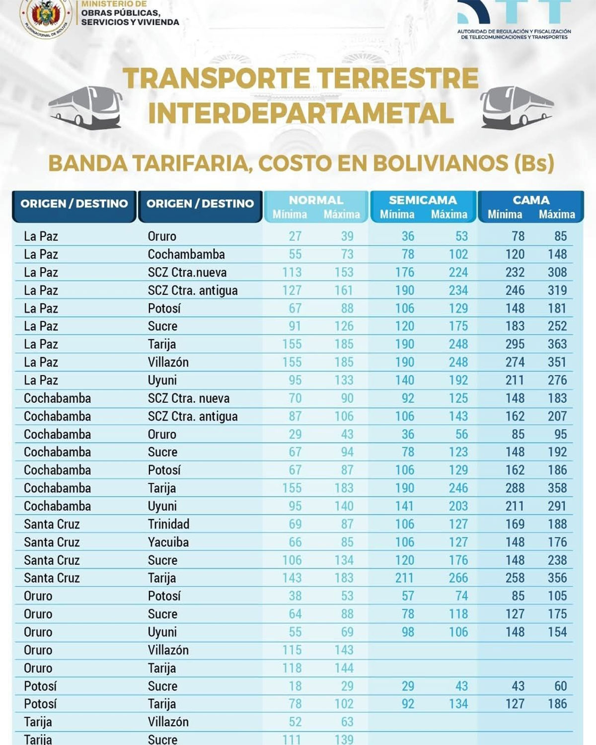 Entre los valores establecidos, una de las tarifas más elevadas corresponde a la ruta La Paz–Tarija en la modalidad de bus cama, cuyo precio máximo autorizado alcanza los Bs 363, según el cuadro tarifario difundido por la ATT.