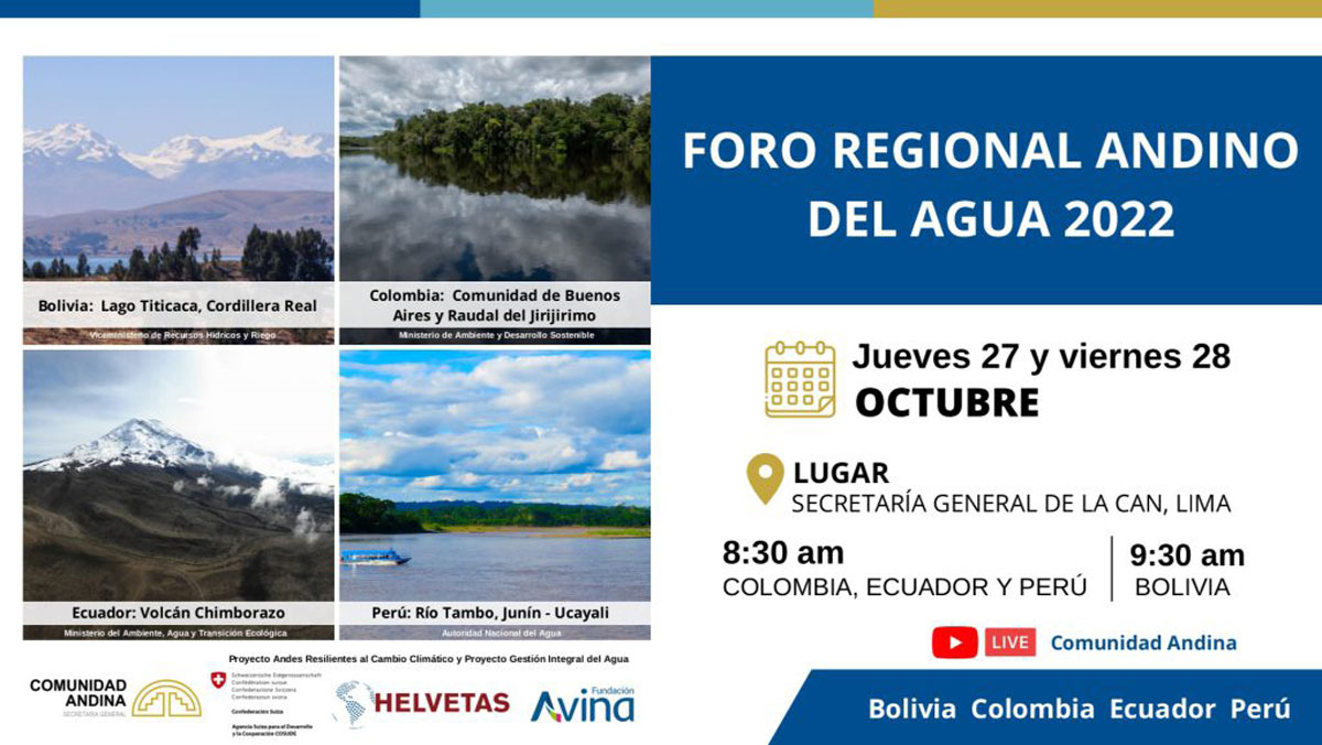 El evento que se desarrollará el 27 y 28 de octubre, es organizado por la Secretaría General de la CAN, con el apoyo del proyecto regional Andes Resilientes al Cambio Climático, facilitado por el consorcio HELVETAS Swiss Intercooperation – Fundación Avina y del proyecto Gestión Integral del Agua de Bolivia, ambos financiados por la Cooperación Suiza – COSUDE.