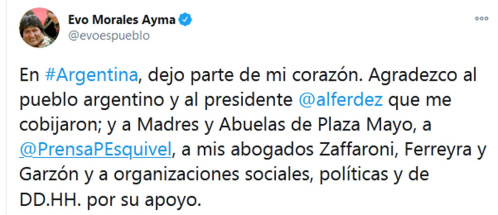 El expresidente Evo Morales se despidió este domingo de Argentina y confirmó su arribo a Bolivia para este lunes. Agradeció al Gobierno del país vecino por el cobijo que le brindaron desde diciembre de 2019, cuando llegó de México, donde se refugió luego de los conflictos políticos y sociales por la denuncia de fraude electoral.