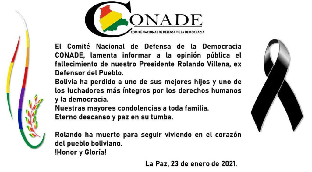 Villena se encontraba internado desde el 11 de enero en una clínica de La Paz y una semana antes había lamentado el fallecimiento de su esposa, Susana Marion Susz, quien murió a causa de la misma enfermedad.